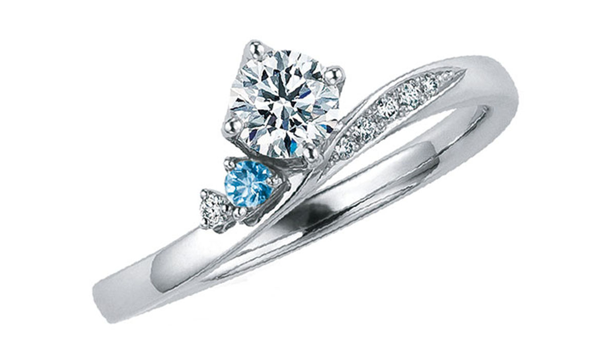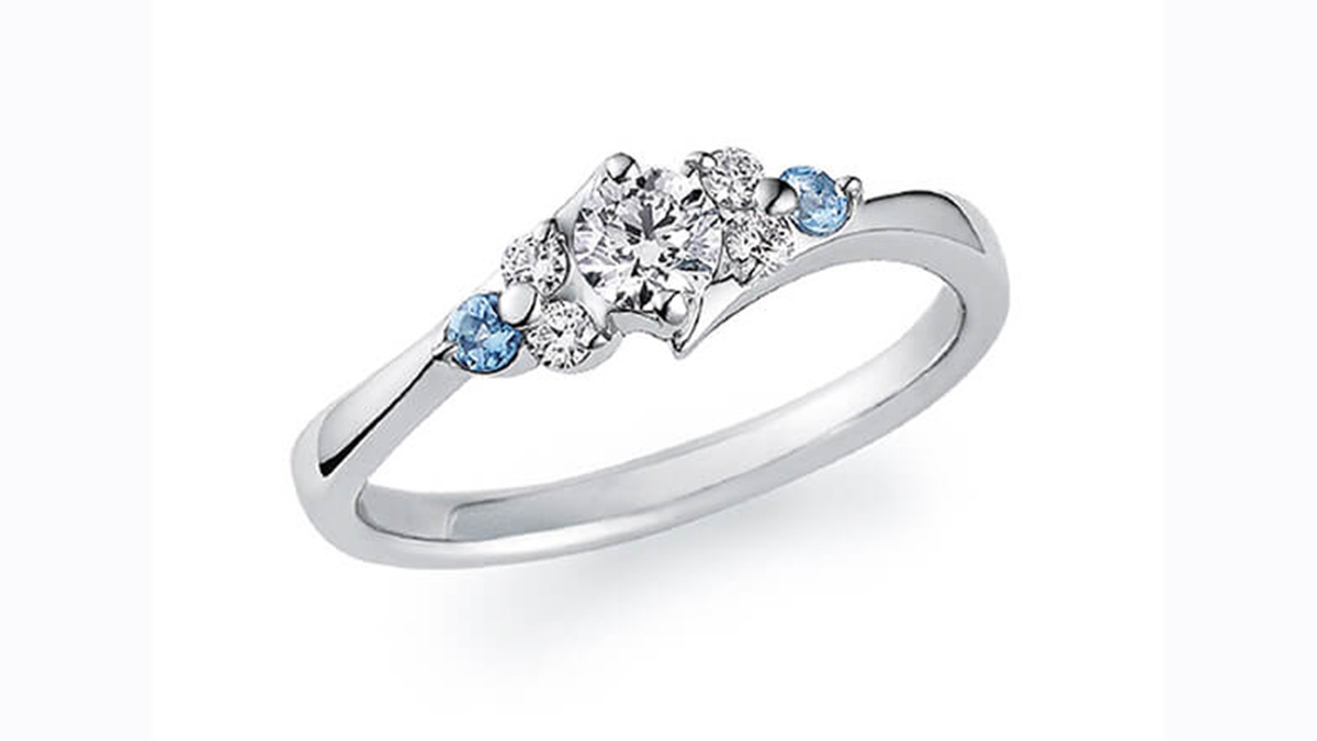 なだらかなアームのラインに沿ってアクアマリンとダイヤモンドがセンターストーンに寄り添う花束のようなエンゲージリングです。