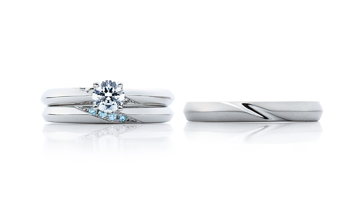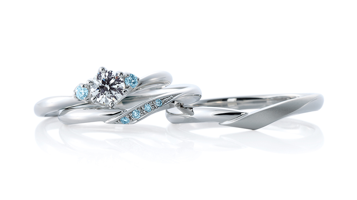 ブルーダイヤモンドと爽やかなアイスブルーダイヤモンドを使ったグラデーションデザインはこのローブドゥマリエならでは。愛らしい婚約指輪と爽やかな結婚指輪が手元でいつまでも輝き続けます。