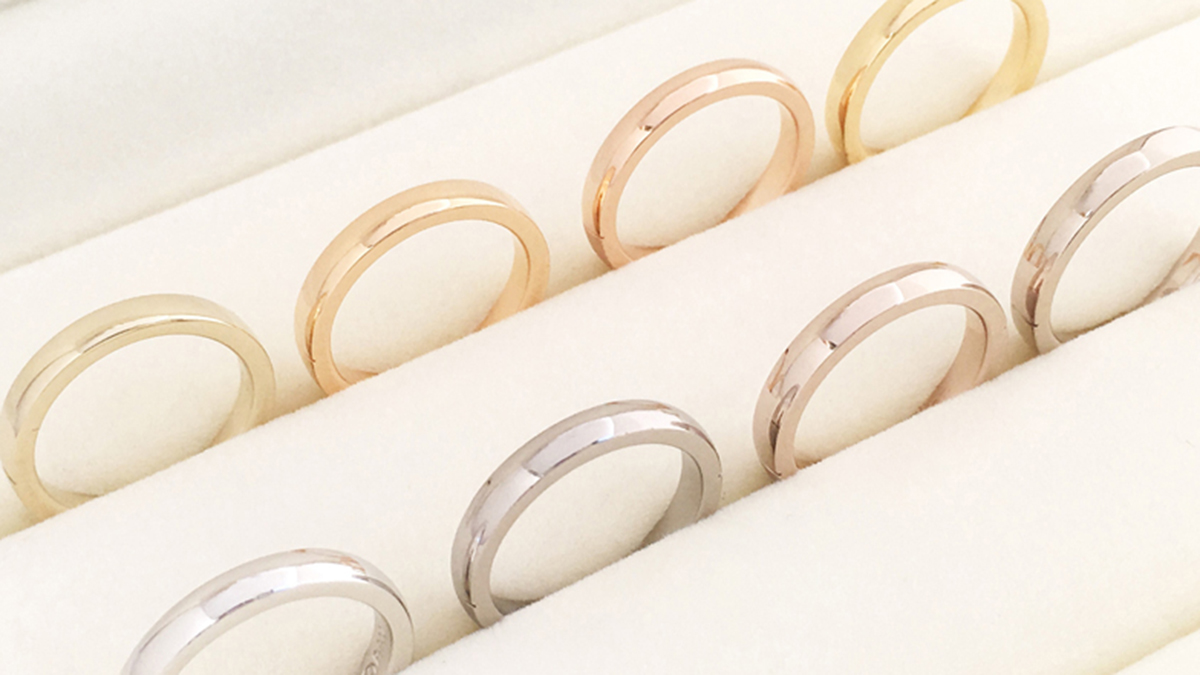 プラチナやイエローゴールドといった定番だけでなく、肌馴染みの良い「シャンパンゴールド」や、落ち着いた印象の「ホワイトゴールド」など、中間色の選択も可能です。シンプルだからこそ、素材の色味がおふたりの肌にどう映えるかが非常に重要になります。