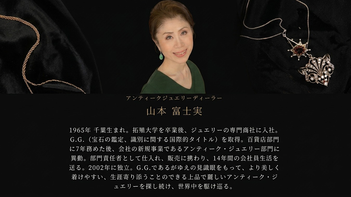 静岡市のジュエリーショップ「ルシルケイ」で開催される本イベントには、アンティークジュエリーディーラーとして30年以上のキャリアを持つ山本富士実氏も来場します。山本氏は、イギリスを中心に世界中を飛び回り、自らの目で厳選したジュエリーを日本に紹介しています。今回の展示会のために、山本氏がロンドンで新たに買い付けたばかりの最新コレクションも多数登場します。