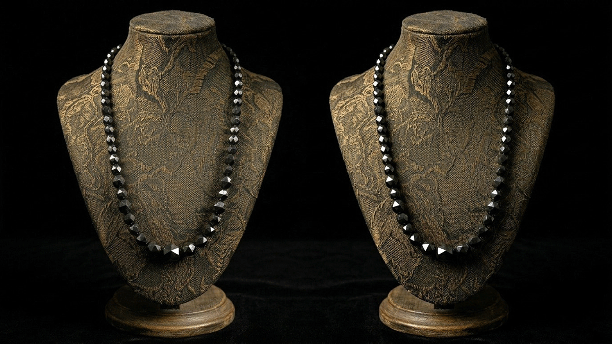ジェットの最大の特徴は、その見た目の重厚感に反した驚異的な軽さです。 アンティークの大きなネックレスや、複雑な彫刻が施された大ぶりのイヤリングであっても、長時間身に着けていて疲れることがありません。これは「化石化した木」という有機物由来の素材ならではの恩恵です。