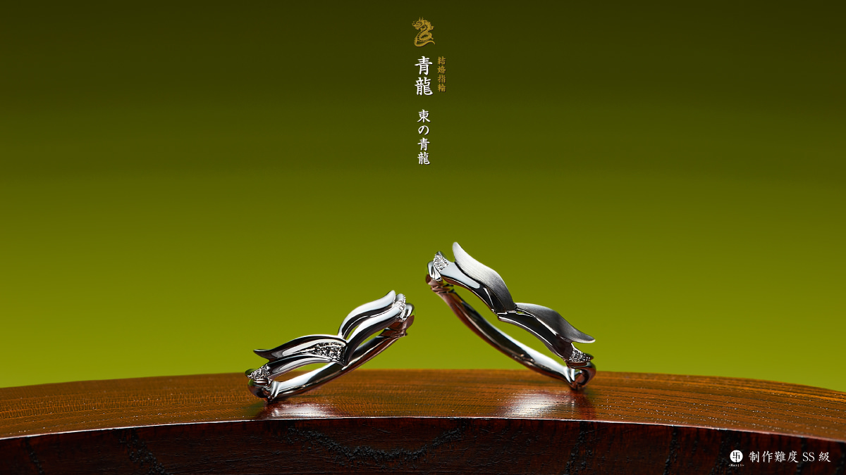 「青龍」は、東の守護神として知られる霊獣・龍をモチーフにしたデザインです。古来より龍は、天と地をつなぎ、運気や繁栄をもたらす存在とされてきました。この指輪作品では上部で龍の髭を、下部で龍の顎(あぎと)を表現しており、空を舞う青龍の姿を繊細な曲線で表現。力強さとしなやかさを併せ持つフォルムには、未来へ向かって進む力や、ふたりの絆を守る意味が込められています。