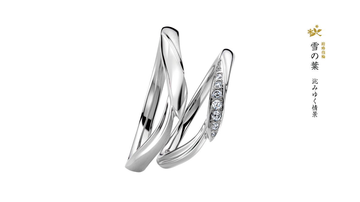 京都にアトリエを構えるブライダルジュエリーブランド「萬時」は、京都ならではの感性を大切にしながら、四季や自然の情景をモチーフとした作品が特徴です。自然や情緒をデザインへと昇華させた指輪は、どれも魅力的です。中でも「雪の葉」は、冬という季節の静謐さと、二人の愛の温もりを重ね合わせた象徴的な作品です。
