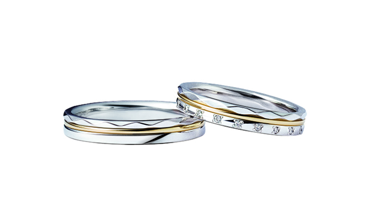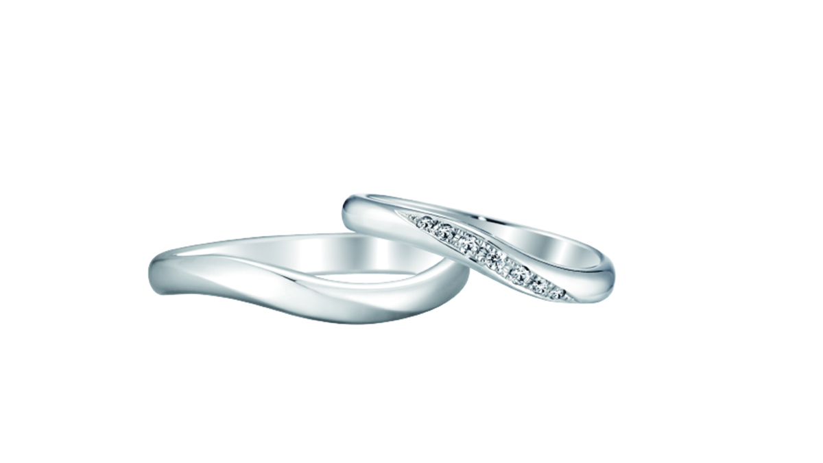 『指を一番美しく見せたい』という願いと『日常のふとした瞬間のときめき』を両立させるデザインです。ウェーブの曲線に沿って、、メレダイヤモンドがセッティングされていることで、視線が指の付け根から指先に向かって斜めに流れます。そのため、指をすっきりと長く見せてくれます。女性らしさを感じるデザインですが、ウェーブラインは隣の指に当たる違和感を感じにくく、着け心地が良いため、男性からも非常に人気のデザインです。