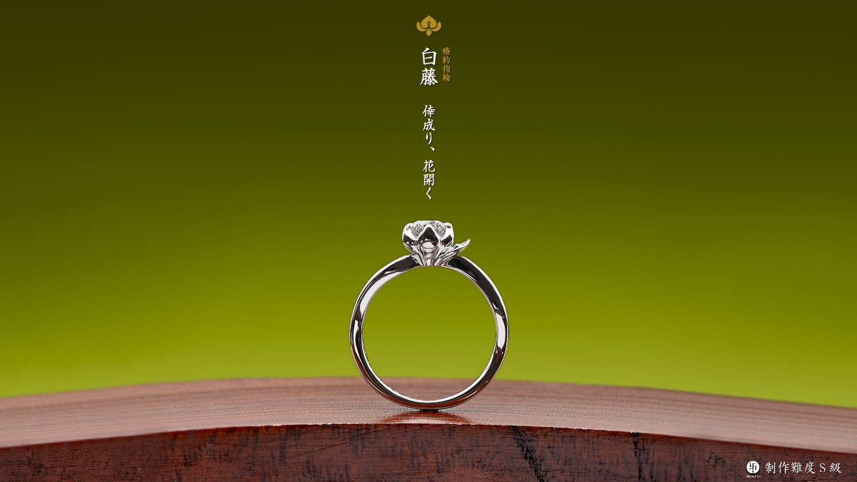 藤の花をデザインした婚約指輪です。藤の花びらは、1枚の大きな花びらが、4枚の小さな花びらを包む様に存在します。大きな花びらを男性に喩え、4枚の小さな花びらを女性に比喩しております。彼に包み守られているのです。個性的ながら、薬指に着けるとシンプルな風合いが、女性にとても人気です。