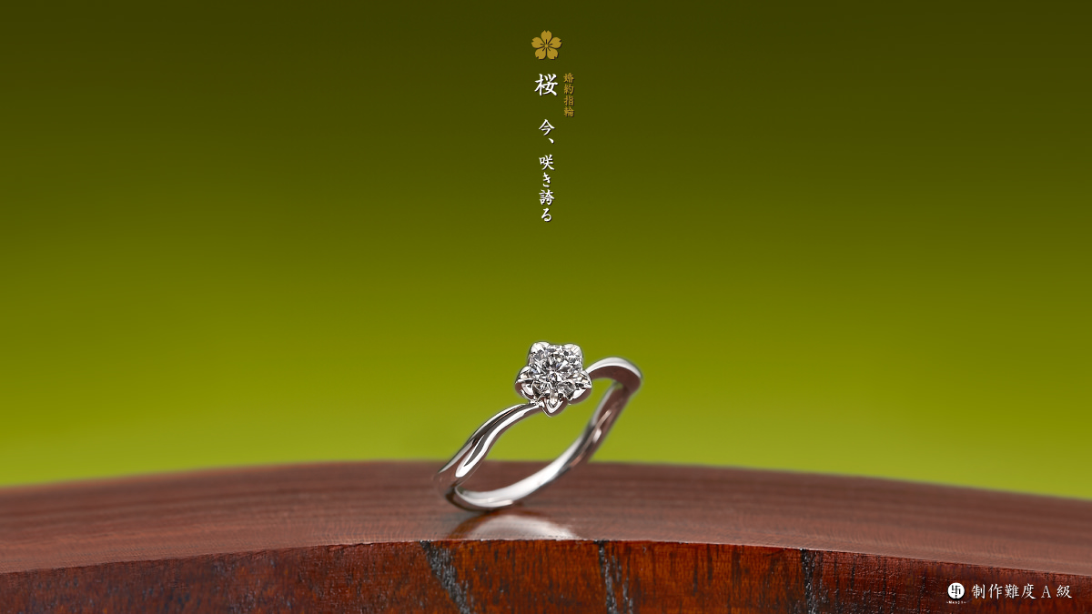 桜の花は、始まりを顕します。二人の新生活や新たな関係性に因みデザインした婚約指輪です。桜の花びらまでも細かく表現するなど、アートデザイナーと職人が何度も試行錯誤した末、完成したこだわりの詰まったデザインです。