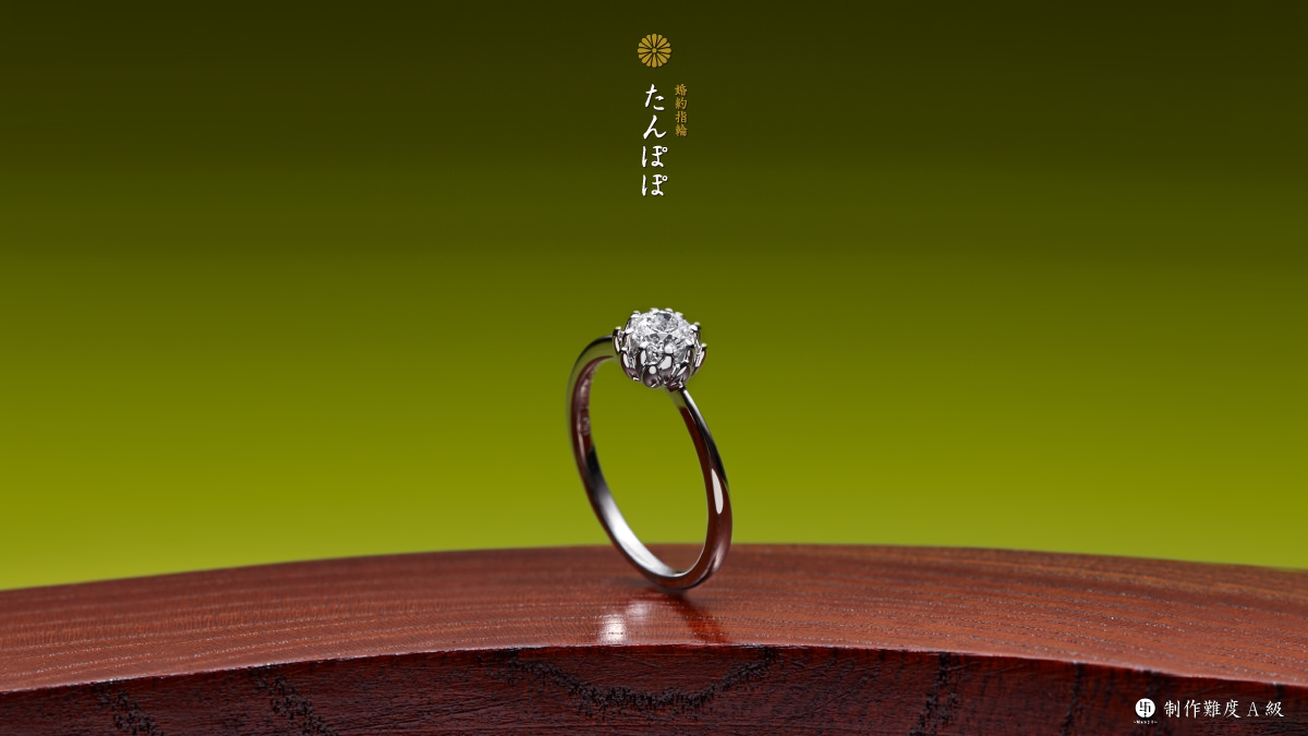たんぽぽの綿毛は、『風にそよぎ倖せを運ぶ』と謂われます。お二人に倖せを運ぶ花として、デザインした婚約指輪です。8枚、8枚の花びらを二重に顕し、たんぽぽの花びらを表現。外側の花びら8枚は、引っ掛かりが無いようにと、1.5mm程低くデザインを施し、工夫して制作しております。シンプルな中に、高い制作技術とアートデザイナーのこだわりを込めたデザインです。