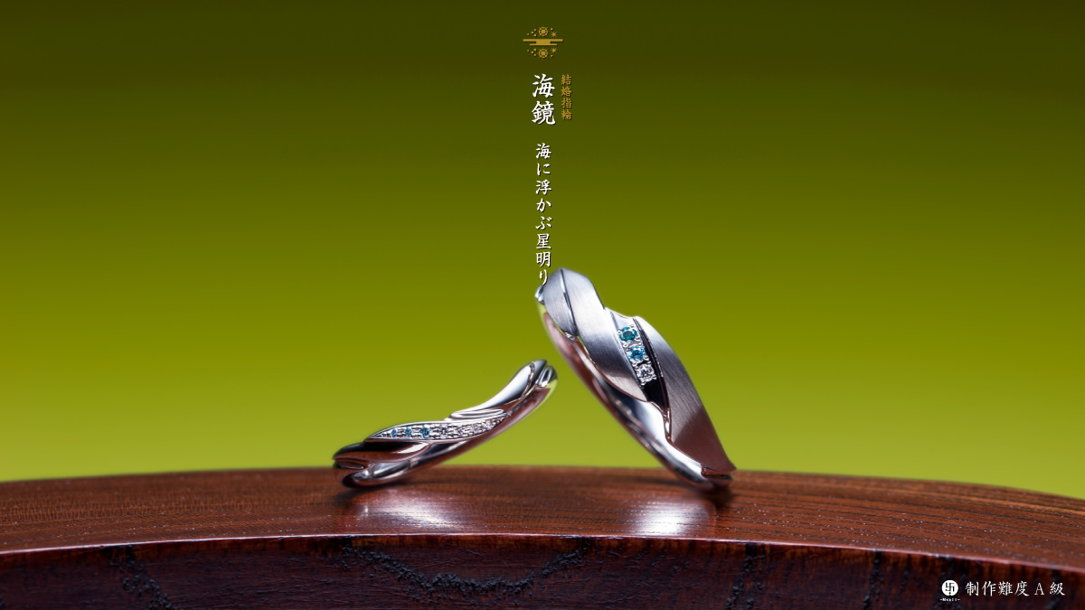 女性用で、夜空に瞬く星々を顕しており、上部の3石は、蒼い星を顕すアイスブルーダイヤモンドとなっております。男性用では、夜の海の波と水面を顕す結婚指輪です。海の水面には、星の煌めきが映し出されているのです。夏の夜の情景を、デザインした意味深いデザインになっております。