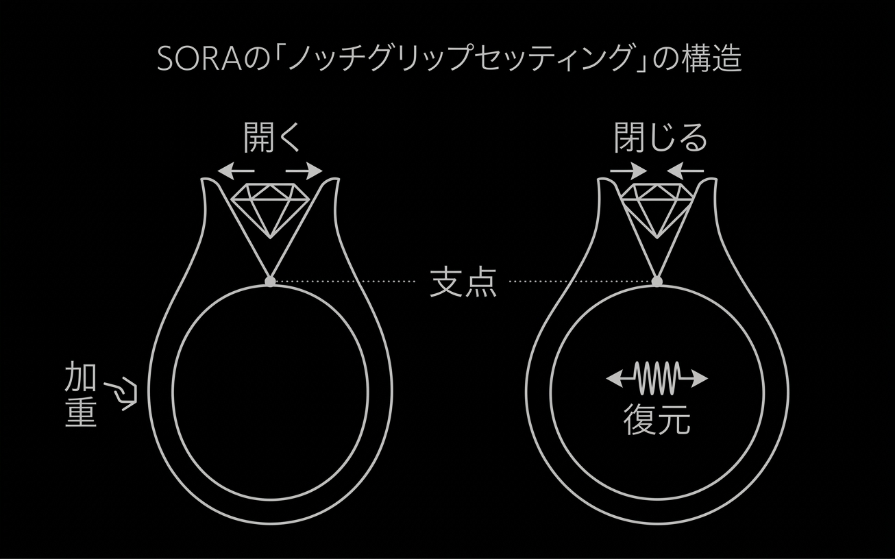 どんなに完璧にカットされたダイヤモンドでも、従来のセッティング(石留め)には大きな課題がありました。金属の「爪」によって光の通り道が遮られてしまう点です。これを解決したのが「ノッチグリップセッティング」です。この技術では、石を留めるための爪を一切なくし、両側からダイヤモンドを挟み込むだけで固定しています。一見すると簡単に外れてしまいそうですが、それを可能にしているのが「64チタン(アルファベータチタン合金)」という特殊素材です。