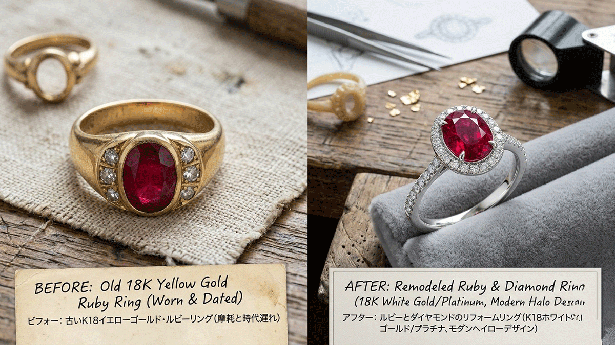受け継いだジュエリーには、持ち主の想いや家族の歴史が宿っています。しかし、「デザインが古くて普段使いしにくい」「サイズが合わない」といった理由で、宝石箱に眠らせたままになっていませんか? 特に鮮やかな赤が目を引くルビーは、時代を超えて愛される宝石の女王。リフォーム(アップサイクル)することで、今のあなたのライフスタイルに寄り添う一生もののジュエリーに生まれ変わります。 今回は、受け継いだルビーリングを現代的に、そして自分らしく蘇らせるためのヒントを詳しくご紹介します。