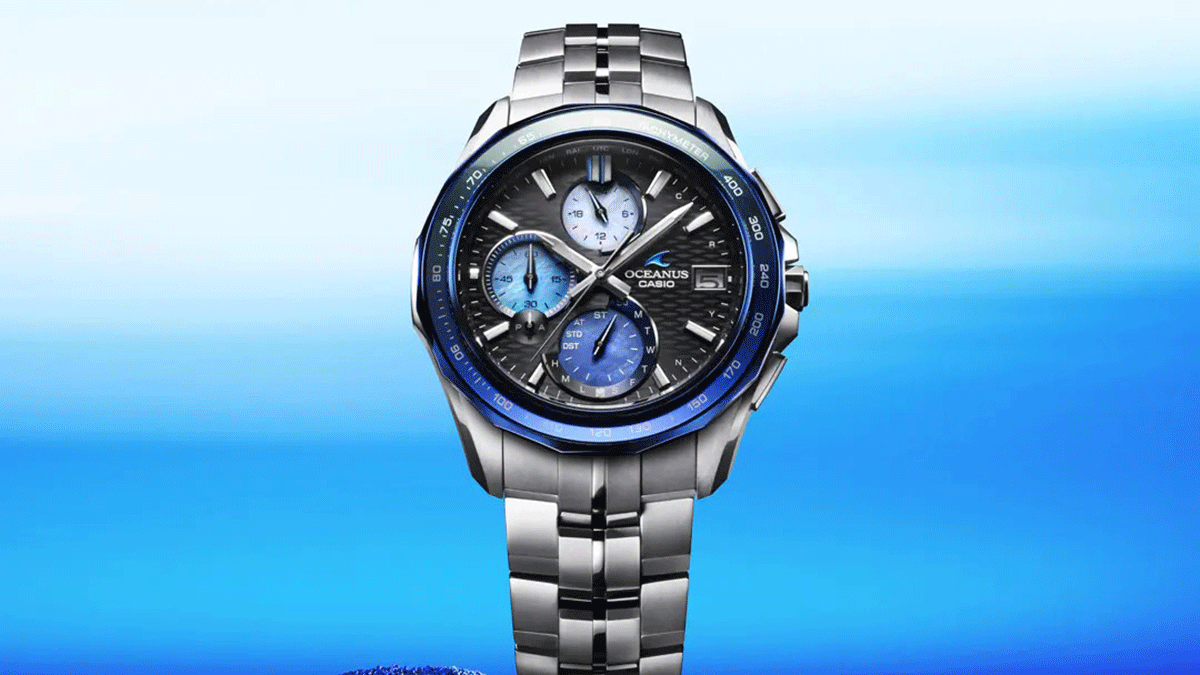 オシアナスの最大の特徴は、ブランドカラーである**「青」**の美しさです。 海を象徴するこの青は、高度な蒸着技術やサファイアガラスの加工によって、光の当たり方で幾重にも表情を変えます。