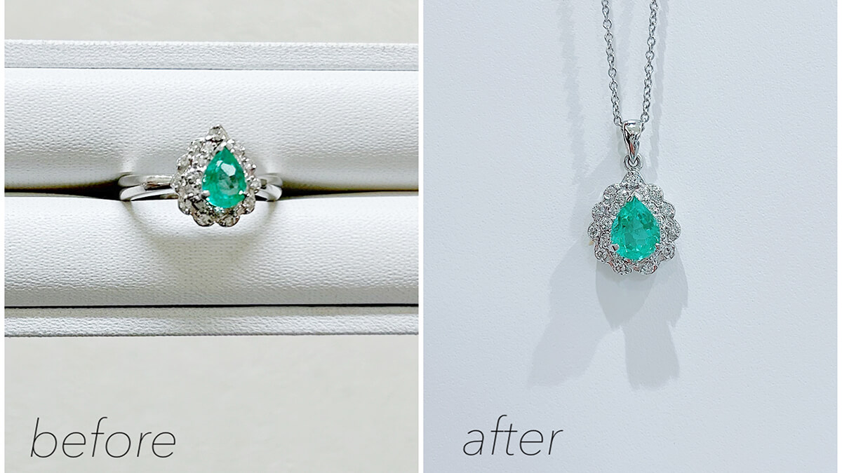 おばあ様から譲り受けたエメラルドの取り巻きデザインを、あえて石座ごと指輪から切り離してバチカン(チェーンを通すパーツ)を取り付けました。